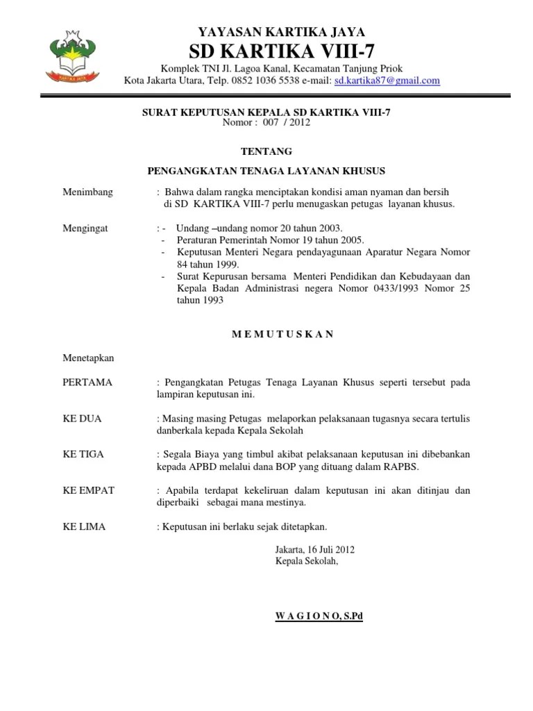 Membuat surat instruksi kepala sekolah. Surat pernyataan kesanggupan untuk melaksanakan kurikulum;; 25.2 satpam, pengemudi, petugas kebersihan, dan pramubakli a. Membuat surat keputusan kepala sekolah. Keputusan bersama menteri pendidikan dan kebudayaan, menteri agama,.
